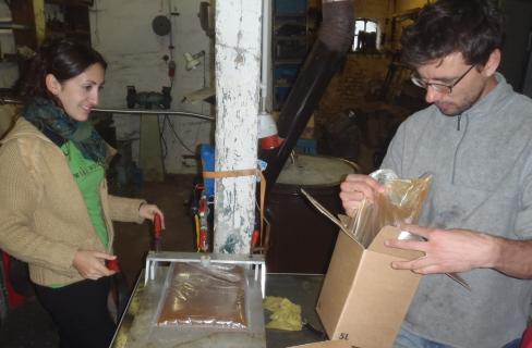 Valeria und Stefan am Ende des Fließbandes unserer Mosterei, der Abfüllung: