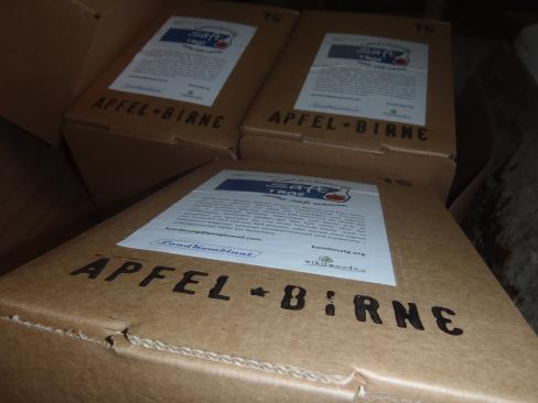 Heute frisch abgefüllt und ab sofort erhältlich: 750 Liter Apfel-Birnen-Saft. Dabei kommen Äpfel und Birnen im Verhältnis 3:1 zum Einsatz. Das Ergebnis ist ein Saft von angenehmer Süße!