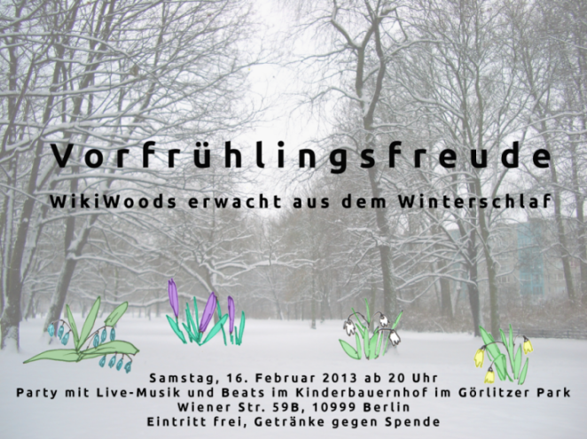 Nun wird es bald Frühling und WikiWoods startet in die neue Pflanzsaison: Zeit, aus unserem Winterschlaf aufzuwachen, die Spinnweben abzuschütteln und uns auf das Sprießen junger Triebe und Blätter vorzubereiten. Das wollen wir mit Euch feiern. Seid herzlich eingeladen zu unserer Vorfrühlingsfreude-Party!